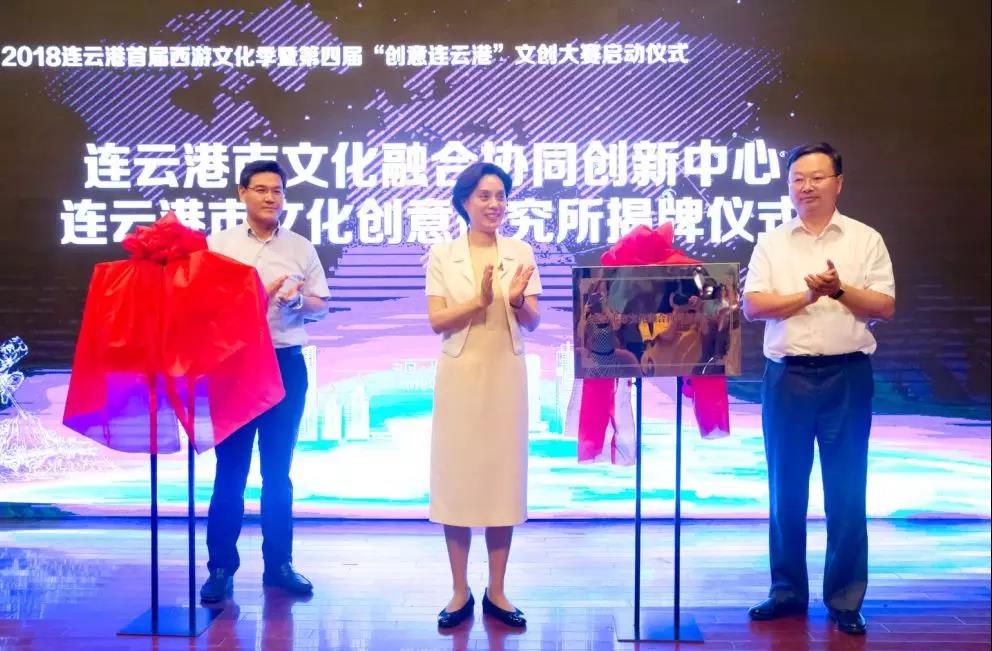 滕雯、宁晓明和杨浩共同为连云港市文化融合协同创新中心和连云港市文化创意研究所揭牌,并启动2018连云港首届西游文化季暨第四届“创意连云港”文化创意设计大赛。连云港市文化融合协同创新中心是市委宣传部与公司艺术公司共建的产学研融合发展中心。