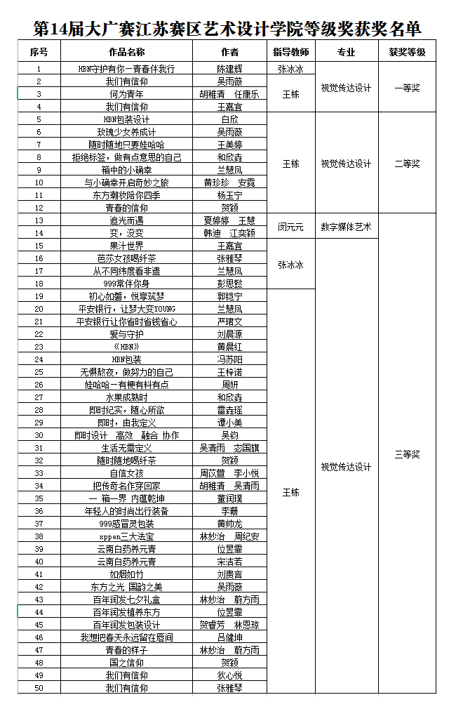 吴雨薇创作的《我们有信仰》、胡稚清和任康乐联合创作的《何为青年》、王嘉宜创作的《我们有信仰》、陈建辉创作的《HBN守护有你—青春伴我行》获一等奖,白欣、吴雨薇、王美婷、和欣垚、兰慧凤、黄珍珍、安霓、杨玉宁、贺颖等9位同学创作的8件作品获得二等奖,一二等奖创作者均来自视觉传达设计专业。王栋老师指导员工获得等级奖作品43件,占全省等级奖总量的4.9%,一等奖数量和等级奖总数量都位列江苏高校榜首。