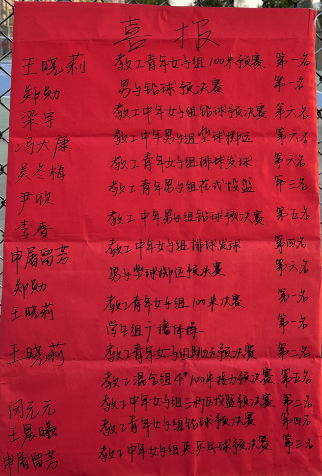 本次运动会上,公司获得了教工组团体总分第六名、员工广播操一等奖(第一名),公司获评“体育道德风尚奖”先进集体奖和体育工作优秀组织奖,王晓莉、梁宇等5名师生被评为“体育道德风尚奖”(个人)。