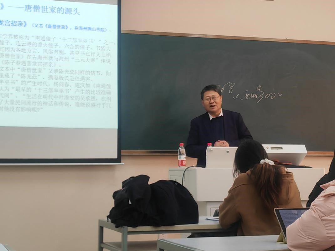 11月28日,连云港市历史文化研究会副会长徐习军在文华楼505教室,进行了“海州状元陈光蕊——《西游记》唐僧世家与海州”的讲座,详细介绍了古典小说《西游记》中的重要角色之一——陈光蕊。陈光蕊本名陈萼,海州(今连云港市)人士,曾在赴洪州上任时为水贼所劫,其子玄奘(即《西游记》中的唐僧)长大后,联合陈光蕊岳父殷开山调兵在洪州剿寇,最终使陈光蕊脱出罗网。徐副会长指出,陈光蕊的形象在宋元戏文中即已出现,《西游记》中有对其的详细叙述。此次讲座不仅向大家介绍了《西游记》中未被充分关注的角色——陈光蕊,揭示了唐僧与连云港的关系,同时也深化了同学们对《西游记》背后的历史文化内涵的理解。徐习军副会长的讲述生动形象,深入浅出,使同学们对西游文化和连云港地方文化有了更深刻的认识。