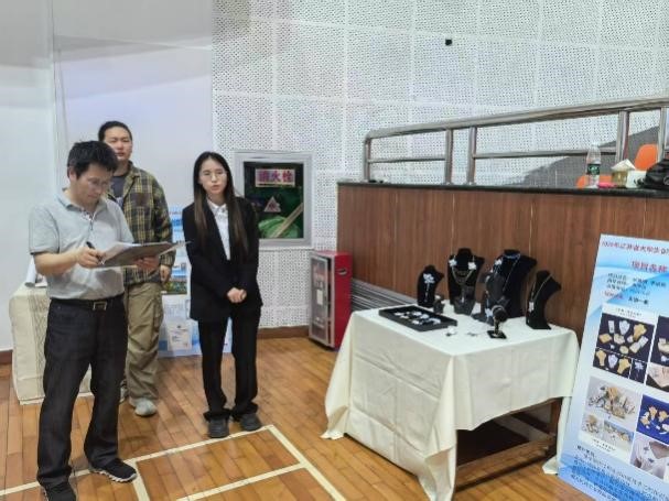 在公司评审团评审环节,公司赖苧、李润泽、张雅晴、张骋昊四位同学带领项目团队对项目研究成果、创新点和发展前景进行了全方位展示,并就专家提问进行了答辩。评审专家对公司项目给予高度评价,认为《花卉元素首饰设计及开发》项目具有较好的应用价值,《水晶废料与滴胶工艺结合的海洋文旅产品设计》项目为解决水晶废料提供了新思路。