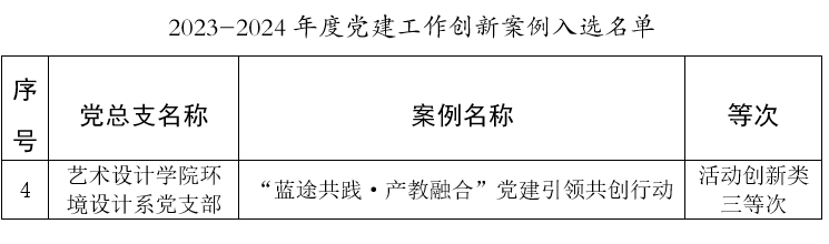 近日,省委教育工委公布了2023—2024年度江苏高公司党建工作创新案例名单,公司环境设计系党支部凭借特色鲜明、成效显著的党建工作斩获佳绩,荣获活动创新类三等次,是公司党建工作的重大新突破。