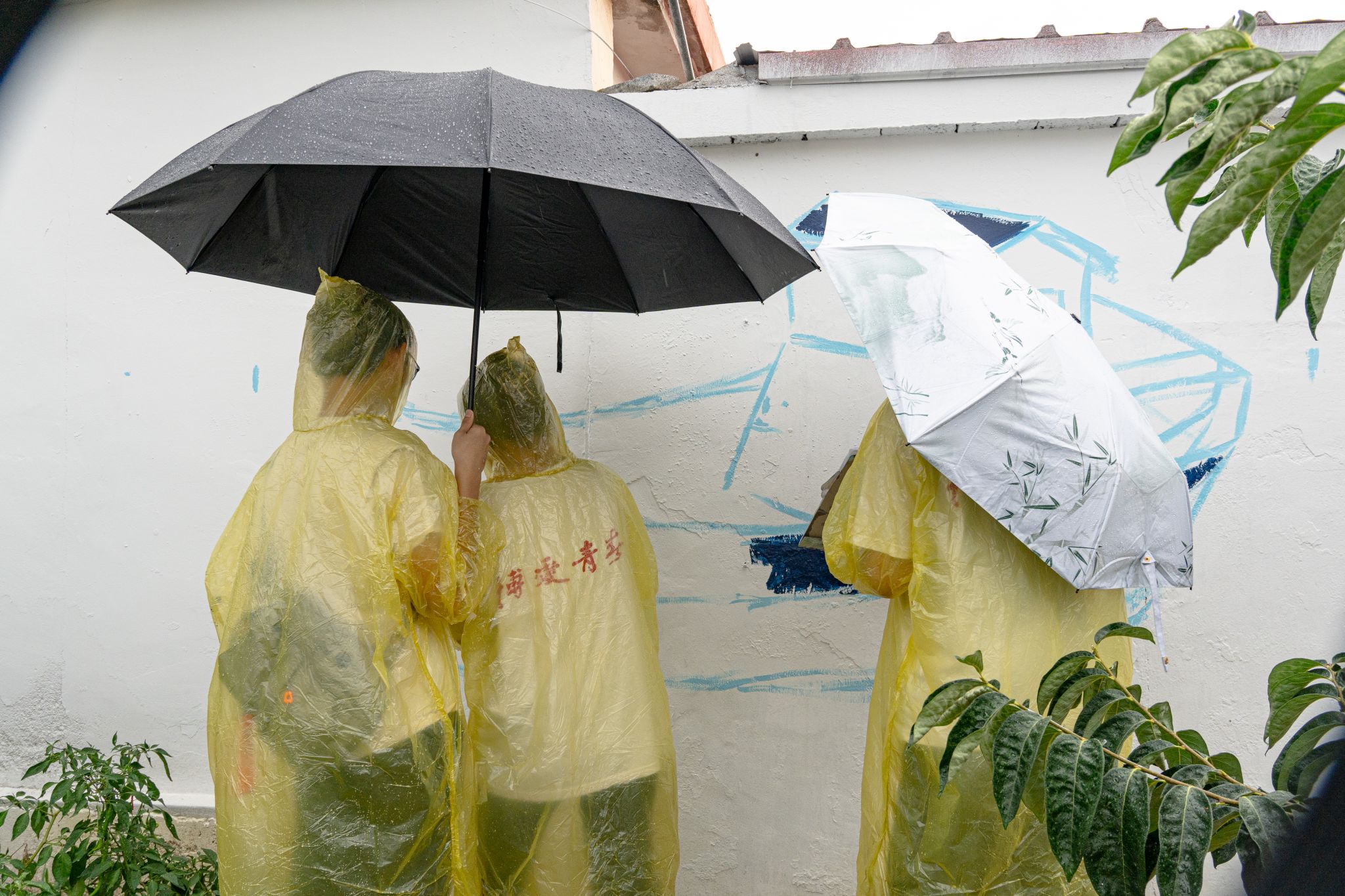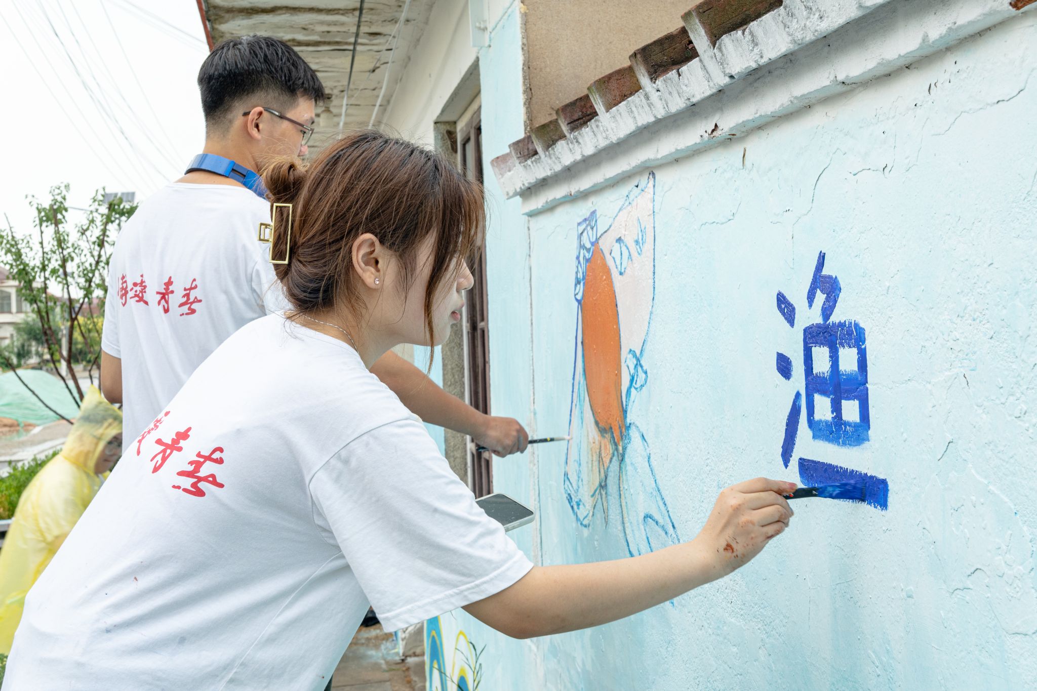 烈日酷暑和瓢泼大雨都没有挡住队员的脚步,雨水晕染了墙上的颜色,就重新绘画补涂,他们踩着泥泞、披着雨衣,在乡村的墙面上一笔笔勾勒“乡村振兴”的美好蓝图。一墙一画一风景,一笔一色皆意趣。经过团队成员数日的精心勾勒,昔日素净的墙面蜕变为一幅幅斑斓画布。当古朴的青砖黛瓦与绚丽的丙烯颜料相遇,当传统的乡村肌理被注入青春的艺术表达,这些充满烟火气与希望感的画面,不仅是对“创新协调”“乡村振兴”的生动诠释,更凝结着志愿者们顶酷暑、冒风雨的担当精神。