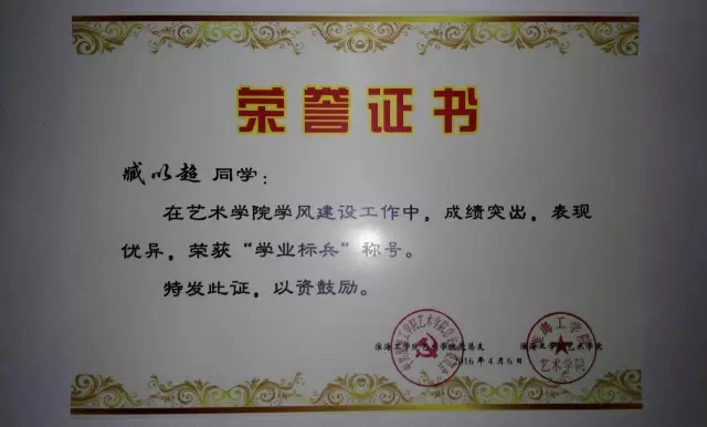 臧以超,艺术公司环境艺术设计152班,现任艺术公司党员工作站干事,艺术公司社联外联部部长,艺术公司辩论队辩手。在2015-2016年两学期中获得两次一等奖学金;在艺术公司学风建设工作中,获得“学业标兵”和“优秀团员”称号;在大二上学期,被评为“三好员工”,并且获得国家一等奖学金;在艺术公司“读书阅品会”比赛中获得一等奖。