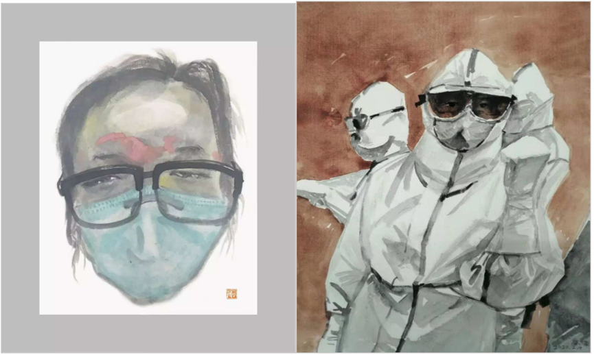 冯大康老师的《抗疫启示录》系列油画作品将“天人合一”“生命”“守望”等理念融入到创作之中,刻画疫情之后的思考和发展理念。葛辉老师的《英雄》水彩作品和杨建辉老师的《最美印记》系列水墨画作品记录和歌颂战斗在抗疫一线的普通医务工作者,表达了对最美逆行者的敬意。