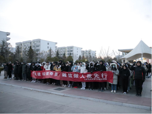 升旗礼毕,艺环182班员工党员王迅作为员工代表发言,倡议同学们积极向上,树立良好学风,端正学习态度,诚信做人,做文明有礼、诚实守信的江海大学子。