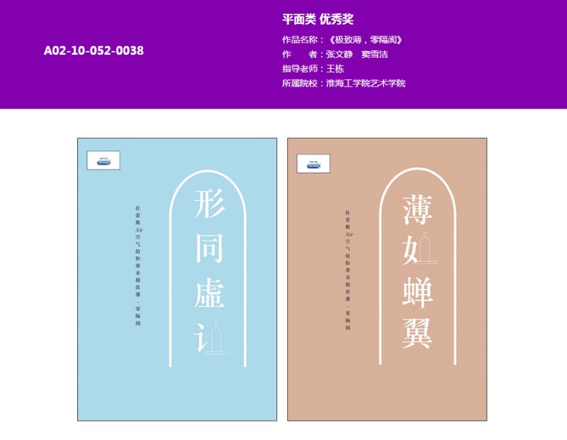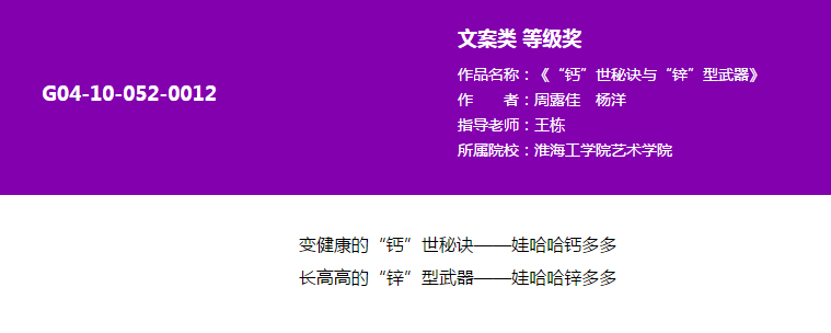 公司周露佳、杨洋联合创作的《“钙”世秘诀与“锌”型武器》获文案类一等奖,刘欣、高亦婷联合创作的《加油,有我在!》获平面类三等奖,李冰洁创作的《装进去就是你的》以及张文静、窦雪洁联合创作的《极致薄,零隔阂》获平面类优秀奖,冯震、唐一铭联合创作的《绝面双椒卡通形象设计》获动画类优秀奖,艺术公司获奖的5件作品全部由王栋老师指导。