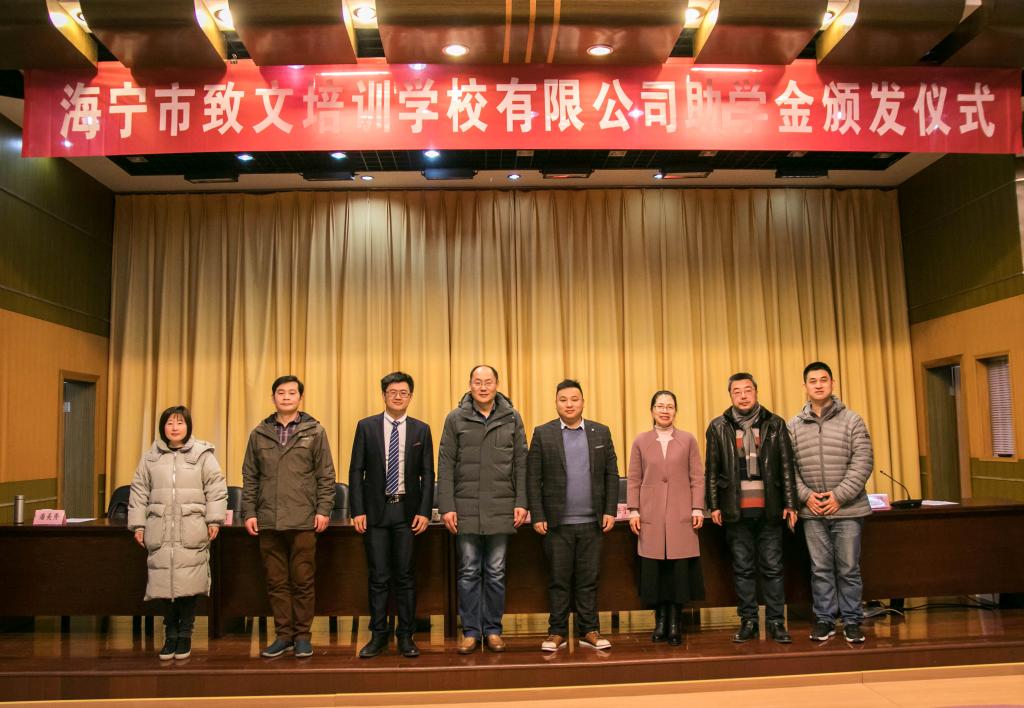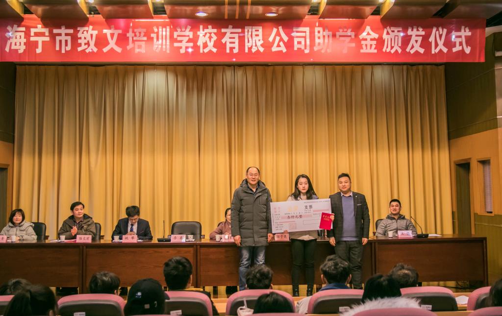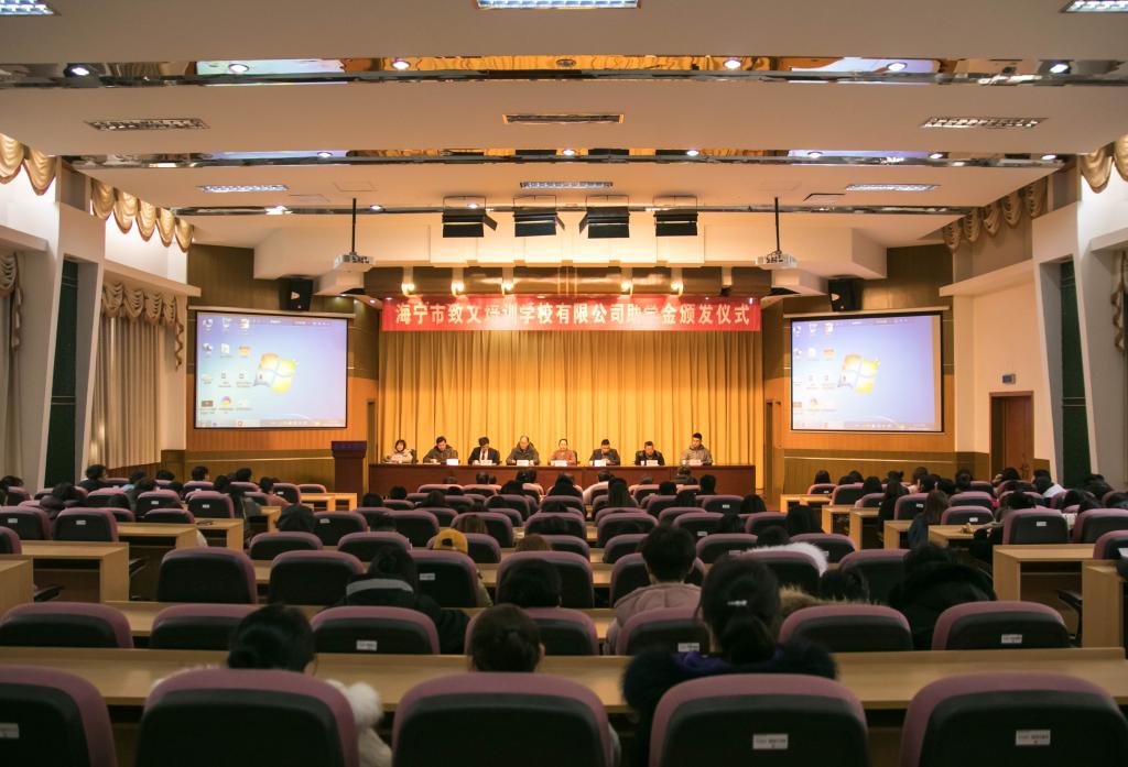 海宁市致文培训公司有限公司2018年在艺术公司员工中开展致文企业标志设计、卡通形象设计比赛,产生了评一等奖2名,二等奖4名,三等奖6名。仪式上,该公司对获奖员工进行了资助。党总支副书记李春表达了对致文培训公司有限公司设立助学金的感谢,同时希望全院师生能够心怀梦想、刻苦读书、树立信心、抓抢机遇。