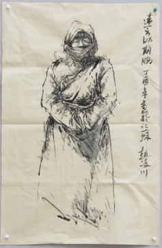赵:这张我是从高一的暑假开始起稿的,一开始是素描稿,后来用毛笔又画到了宣纸上,我上了大学后,也就是2017年的春节期间,这张画才真正完成,然后又对纸张进行了复古。我很喜欢画长卷,尤其是人物画,线性画,这张画讲述的是蟠桃盛会,道家八十七神仙共赴天宫朝拜元始天尊的情景,开头和结尾的四位是四大天王。我很喜欢道教,那幅《群仙欣会图》也是关于道教的。所以,大多都是这个题材。还有现在展厅里那幅小型的线描人物画《永乐宫一角》也是关于道教。