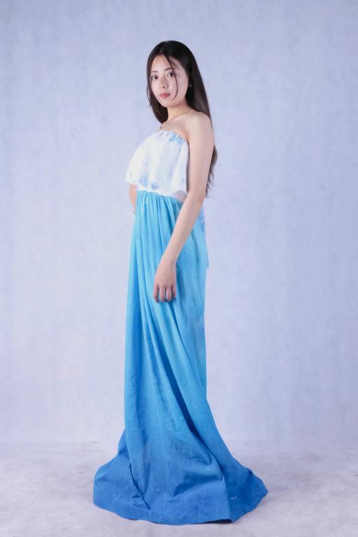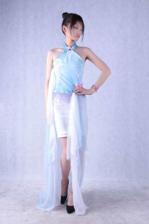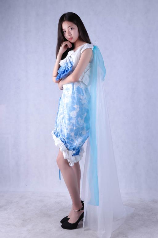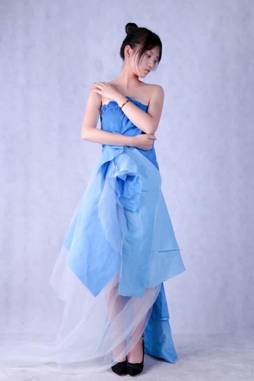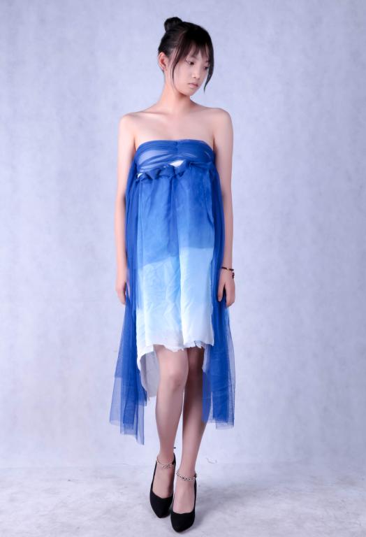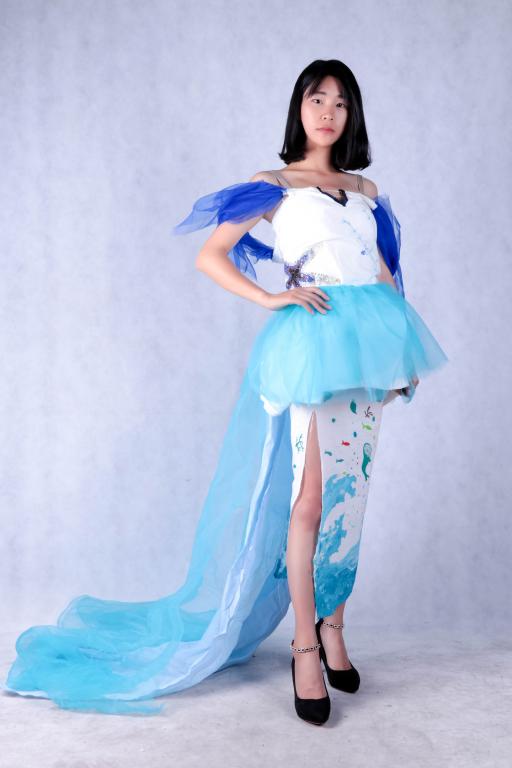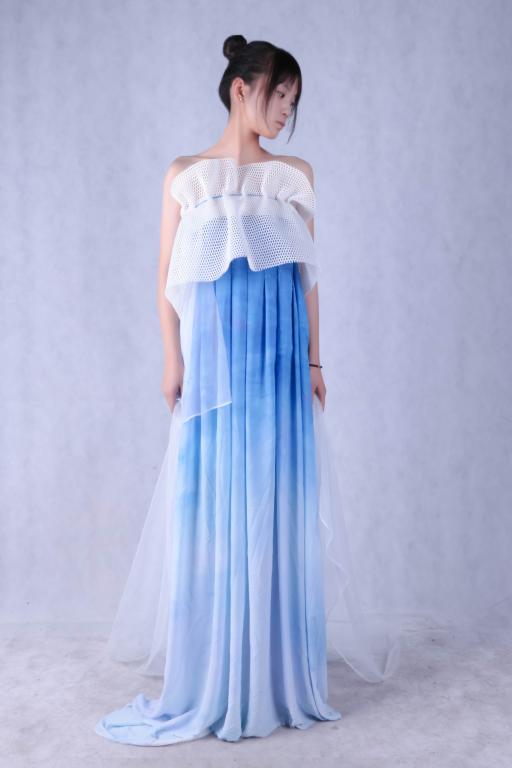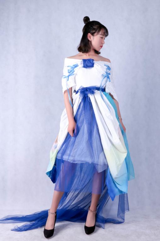 服装是以海洋为主题设计的礼服,以蓝色白色为主。上身短款背心,以三层蓝色渐变的扇形褶皱为亮点。过渡的颜色由浅入深,与下半身裙印染的颜色相呼应。里裙以不规律的褶皱以及白色雪纺花边收边,象征的是海边翻起的浪花,侧边腰线以蓝丝带作为松紧调节的绑带,同时也起着装饰的作用。肩上长段蓝纱,不同于裙子的钴蓝,更为整体裙身增色。
