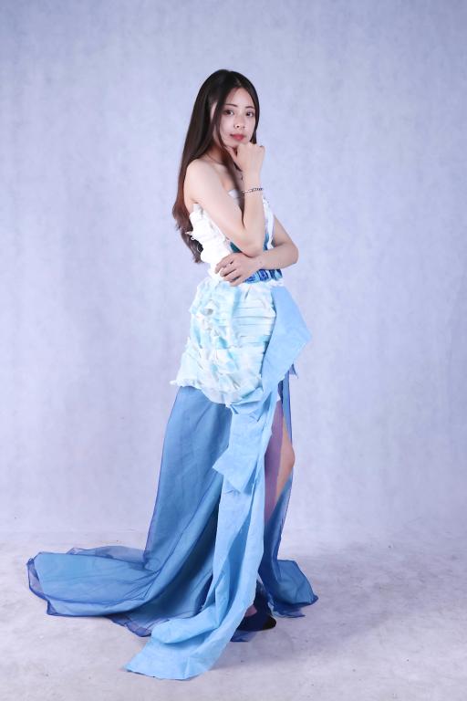 服装以海洋为主题,主题色为蓝色,服装上衣部分,采用白色镂空网状布料,在布料中间位置用蓝色丝带环绕穿出褶皱,从背后穿出做打结装饰。长裙部分采用垂感十足的雪纺布料,加以深蓝浅蓝以及紫色染色,制作出渐变蓝紫色的布料,在高腰位置缝制褶皱,让雪纺布料的垂感更好的显现出来,在裙摆的后面缝制一层轻质的白纱,透过白色薄纱与蓝紫色相融合,体现海洋特色的梦幻与神秘。带有蓝色丝带点缀的白色褶皱上衣与蓝紫色渐变长裙以及拖地的后摆薄纱相结合,使得整体效果更加凸显。