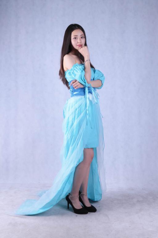 此次服装设计主题为海洋元素,我们的设计理念同样以海洋的蓝色为主题,但说起海,不同的人也有不同的看法,有的人说起海便想起它的美好静谧,有人说起海便会想起它的深不见底,我们的服装色彩便只采用了它的安静,运用天蓝色作为服装的主色调,加入晶蓝色作为点缀,使服装舞台效果更加突出。衣服的亮点为一字肩和腰带的设计,一字肩的采用更加突出来女性的性感,腰带的丝带设计采用了当代的流行元素和裙子的结合同样体现了女性的身材。衣服的外纱运用了欧根纱,给人一种神秘美丽的景象。