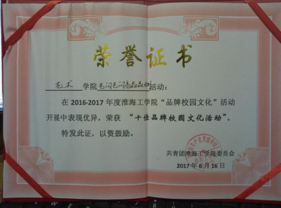 近日,从校团委传来好消息,艺术公司青年志愿者协会在2016-2017学年度举办的“艺闪艺闪 亮晶晶”系列活动荣获淮海工公司“十佳品牌校园文化”活动称号。
