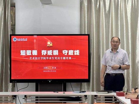 座谈会最后,李春以“知敬畏 存戒惧 守底线”为题给全体毕业生党员上了党纪学习教育的专题党课。