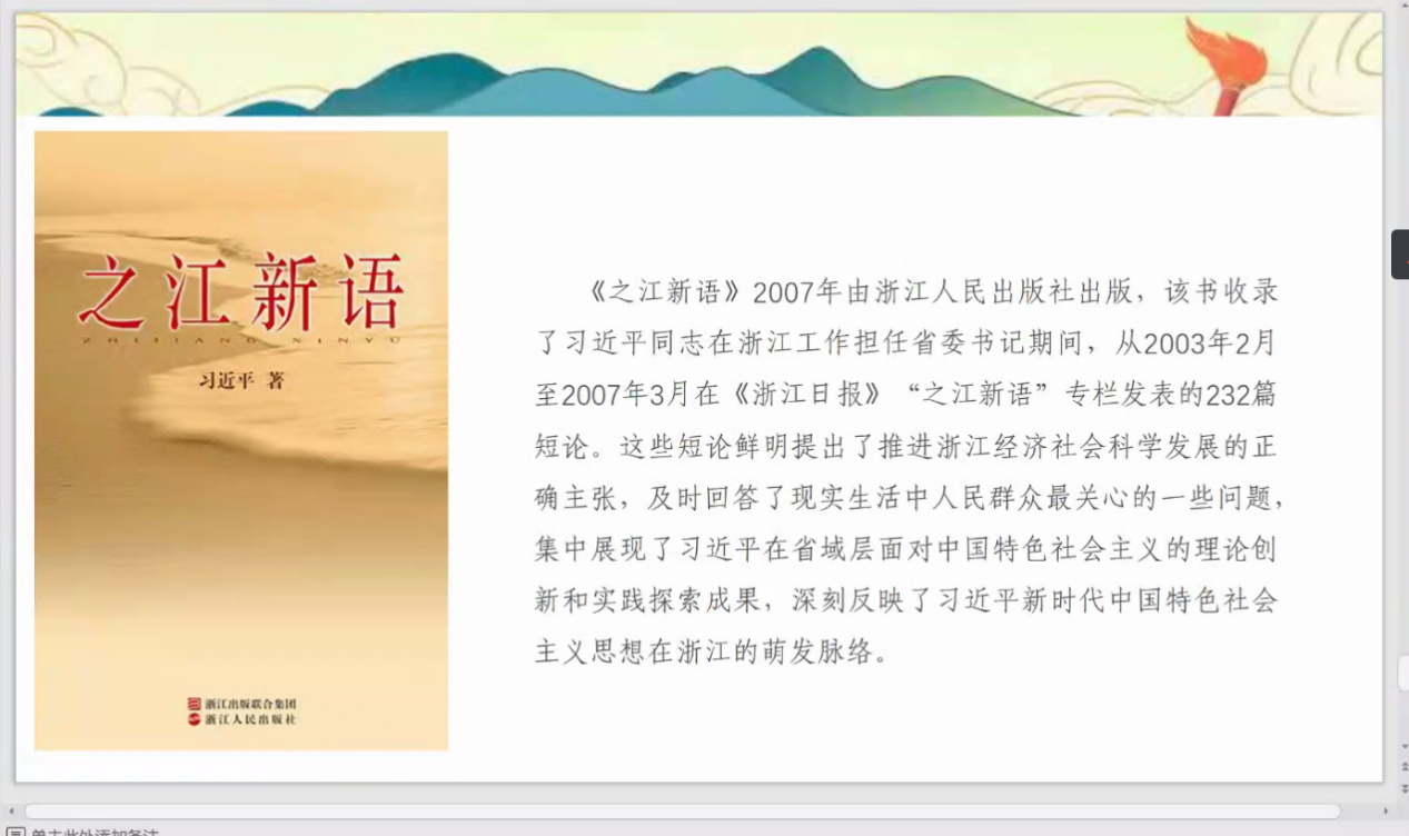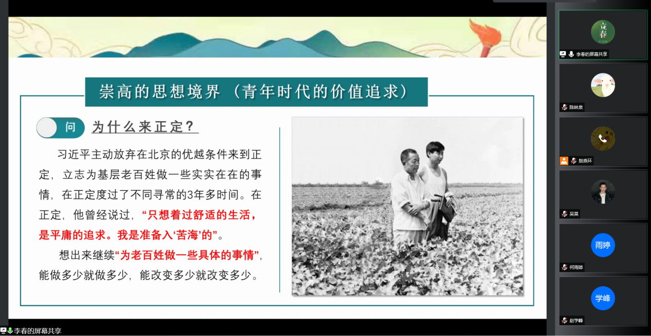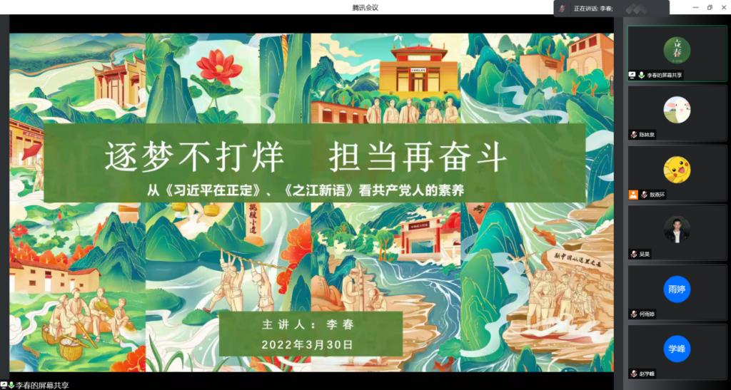 3月30日晚,公司党总支书记李春以“逐梦不打烊,担当再奋斗”为主题开展了一次线上党课培训。李春分享了阅读《习近平在正定》《之江新语》两部经典红色书籍后的深刻感悟,为公司员工第一、第二党支部全体员工党员上了一堂生动的党课。公司党总支副书记王欢、副处级组织员吴良军、辅导员敖燕环、徐熙檳一同参加了学习。