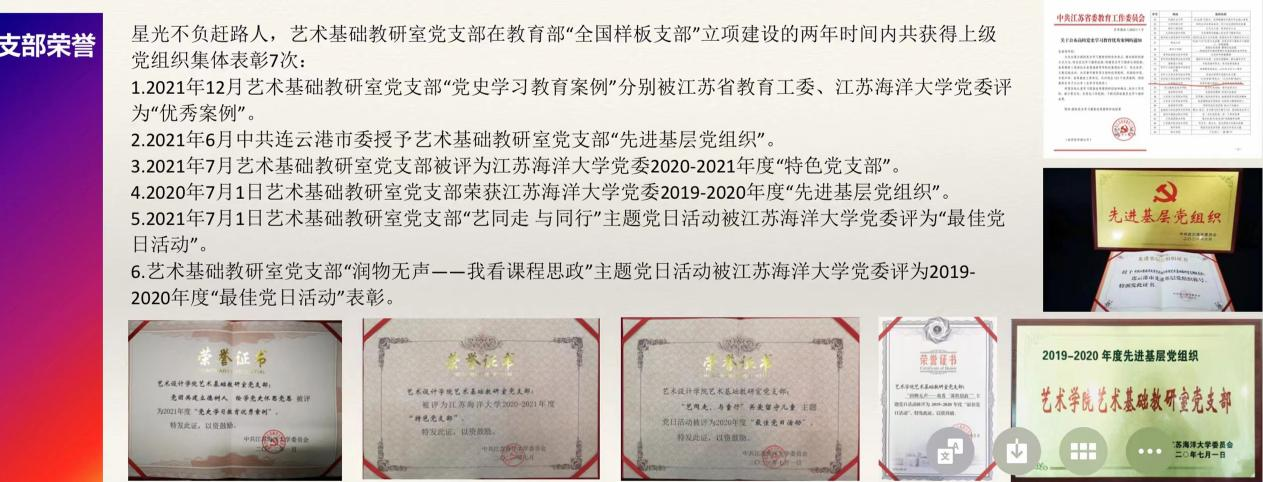 培育期内,支部先后被评为公司和连云港市先进基层党组织等集体荣誉称号,1个案例被江苏省省委教育工委评为“党史学习教育优秀案例”, 2项活动获评校级“最佳党日活动”,通过了校“双带头人支部书记工作室”验收,陆续涌现出 “三育人”先进个人、“优秀共产党员”“老员工最喜爱的老师”等先进典型党员代表。经过两年的建设,支部特色化和品牌化明显,“七个有力”提升显著,全面形成一个学习型、凝聚型、研创型、服务型党支部。