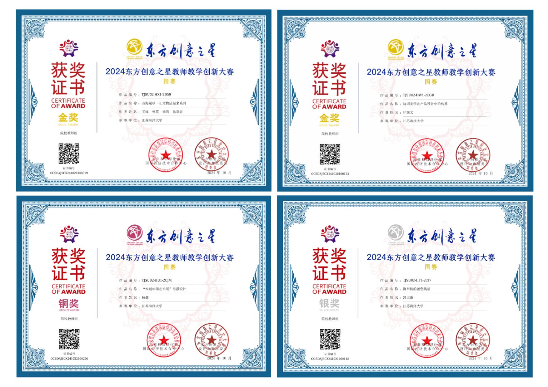 近日,2024东方创意之星教师教学创新大赛国赛获奖名单公布。公司东家智创设计创新实践工作室的王栋、曾英、杨清、孙嘉尉教师团队的项目《山海藏珍——让文物活起来》在“项目与课题”赛道、印茜文老师的的美育教学项目《诗词美学在产品设计中的传承》在“课程与教学”赛道分别获得金奖;冯大康老师的作品《海州湾的蓝色眺望》与解健老师老师作品《“木刻年画艺术展”海报设计》分别获得银奖和铜奖。