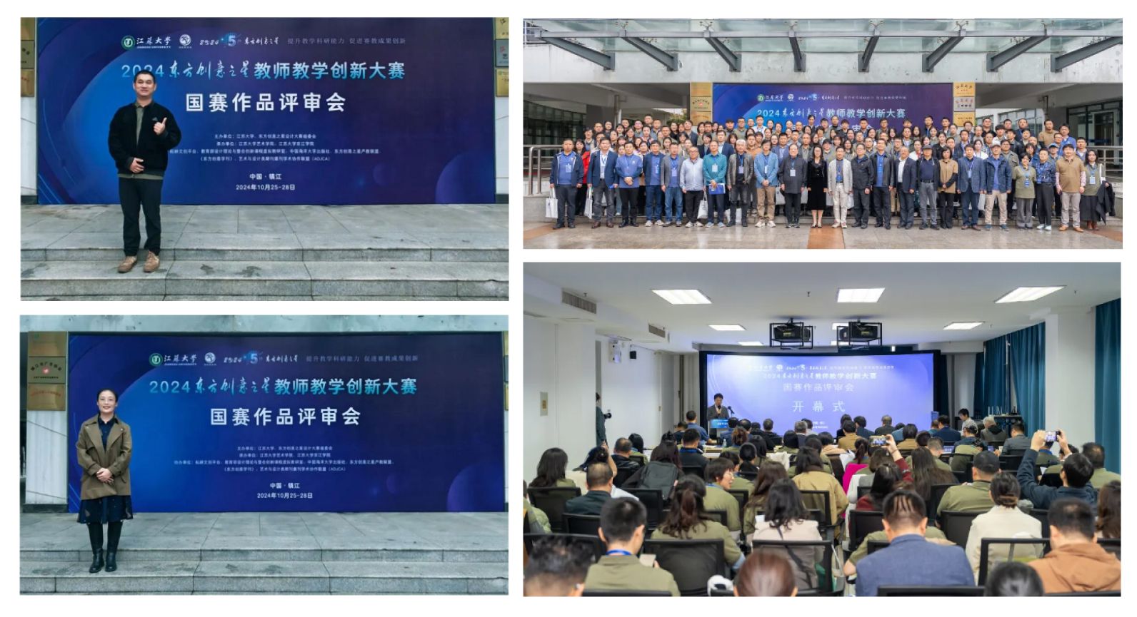 2024年10月25—28日,2024东方创意之星教师教学创新大赛(以下简称教师赛)国赛评审会在江苏大学隆重举行。本届教师赛分为27个省赛区,采用“校赛、省赛、国赛”三级赛制,来自国内30个省区市,441家单位,1924人的1815件作品进入省赛。来自工业和信息化部国际经济技术合作中心、上海原创设计大师工作室、中国计量大学、江苏大学、中国美术公司、上海杉达公司、同济大学、南京工业大学、东南大学、华东师范大学、山东大学、贺州公司、江南大学、CDS中国设计师沙龙、大连工业大学、集美大学、上海工程技术大学、《上海视觉》学报等国内著名院校及设计行业的22位领导、知名教授及专家组成国赛评委会,参加了本次国赛终评工作。来自全国25个省区市的96家单位(涵盖天津美术公司和上海大学、东华大学、中南大学等14所“双一流”高校),共计126位参赛代表(23位经理/副经理/教务处长,1位博士生导师、2位博士后、36位博士,45位教授/副教授等高层次参赛作者)参加了线下答辩。经过国赛初评、复评,139件作品获得全国总决赛金奖候选资格,通过线下答辩等终评既定流程,最终决出四个赛道的金奖96件。